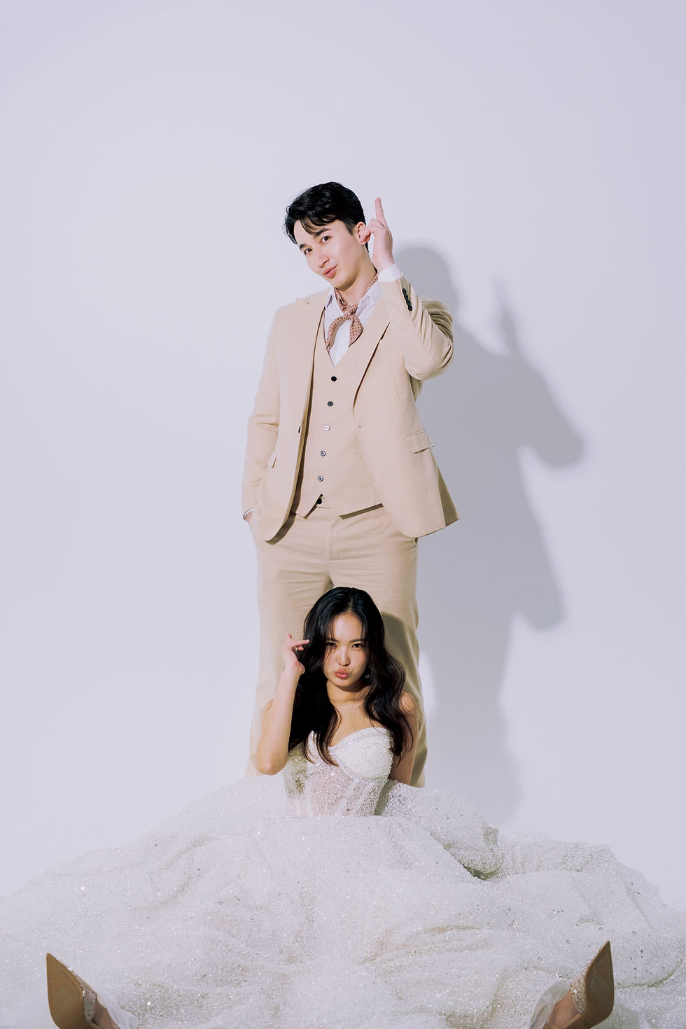 在拍攝引導上,刻意保留更多互動空間,讓新人透過對話與肢體接觸自然流露情感,捕捉最真實且耐看的婚紗影像。這類韓系清新風格的棚拍婚紗,也非常適合喜歡簡約與耐看質感的新人。