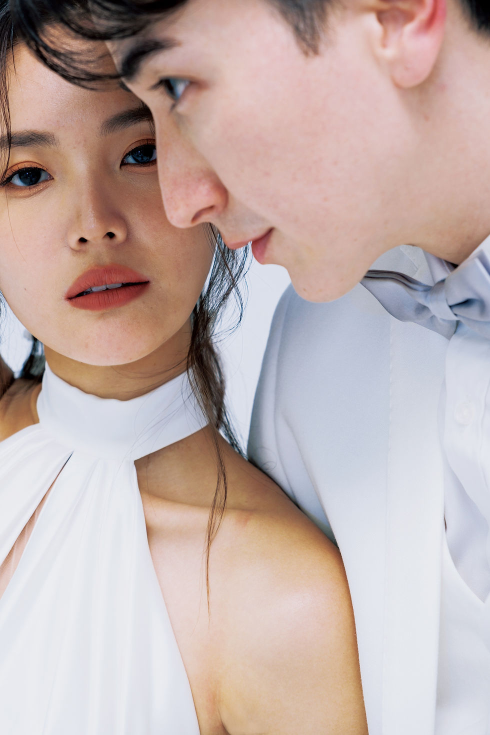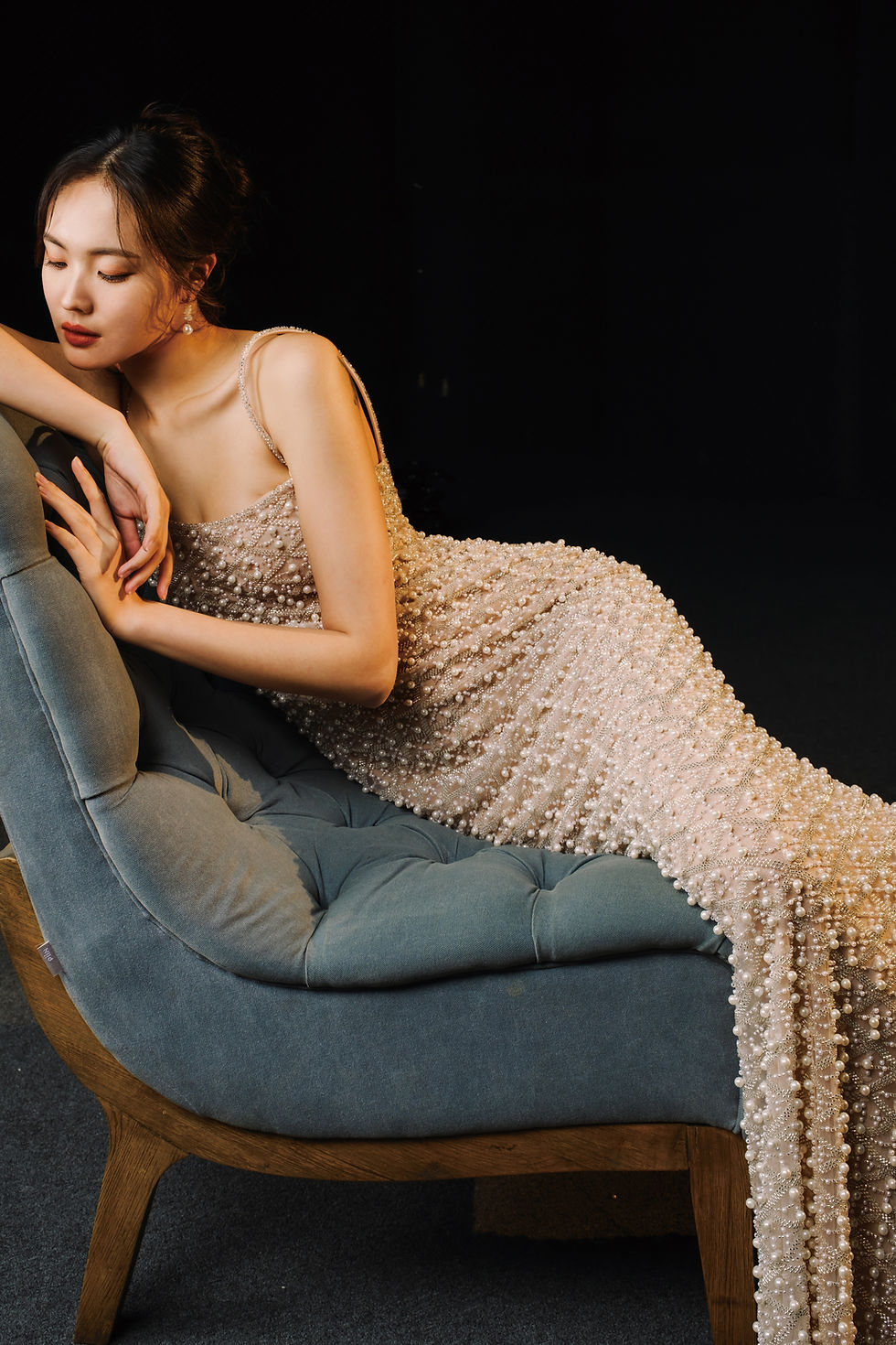 第二套禮服選擇線條俐落且具設計感的高級典雅款式,整體拍攝方向轉為時尚雜誌封面風格。透過降低色溫與特殊燈位安排,刻意營造冷調且帶有距離感的視覺效果,呈現出帶有態度與張力的影像質感。